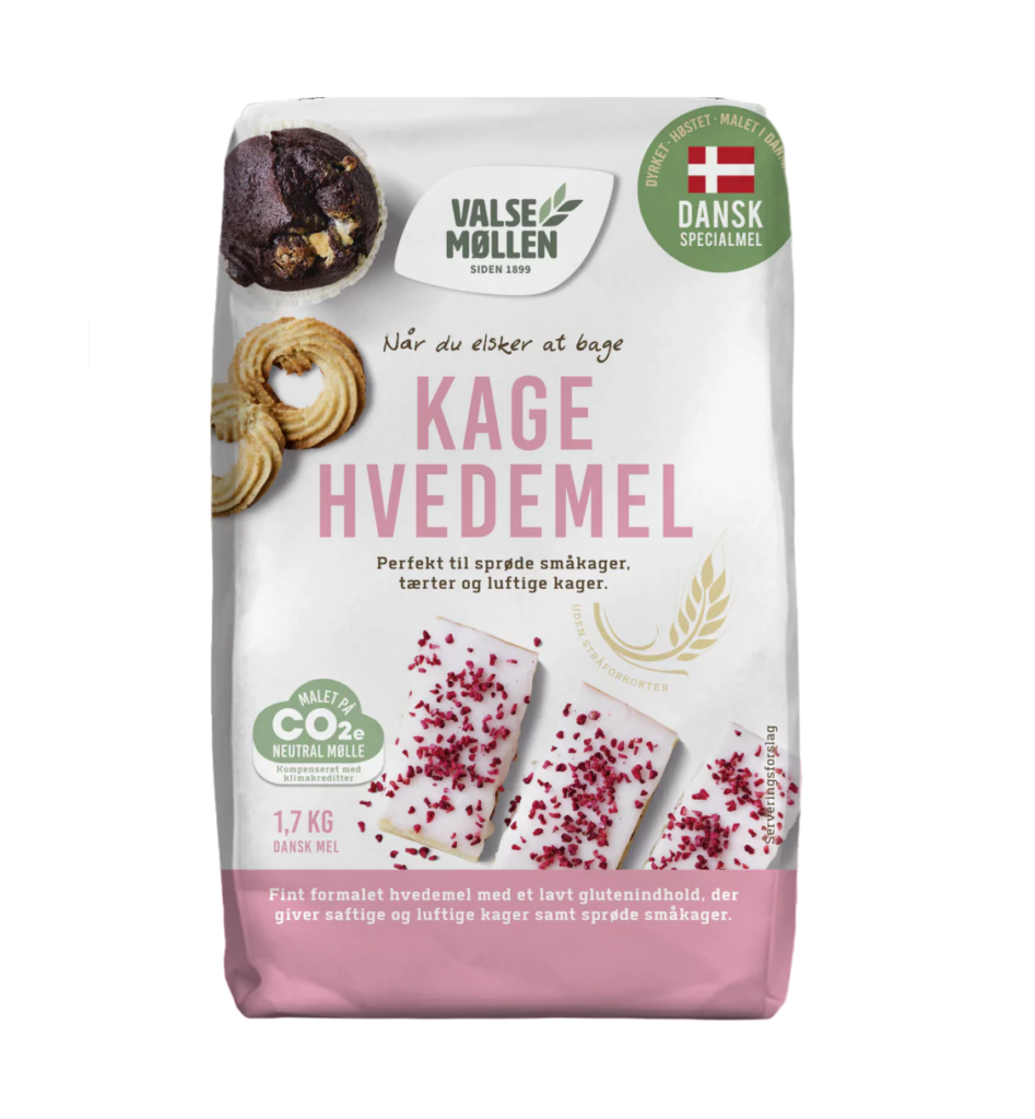 Valsemöllens Kage Vetemjöl är gjord av dansk vintervete som har lägre gluteninnehåll än vanlig vetemjöl till t.ex. bröd.