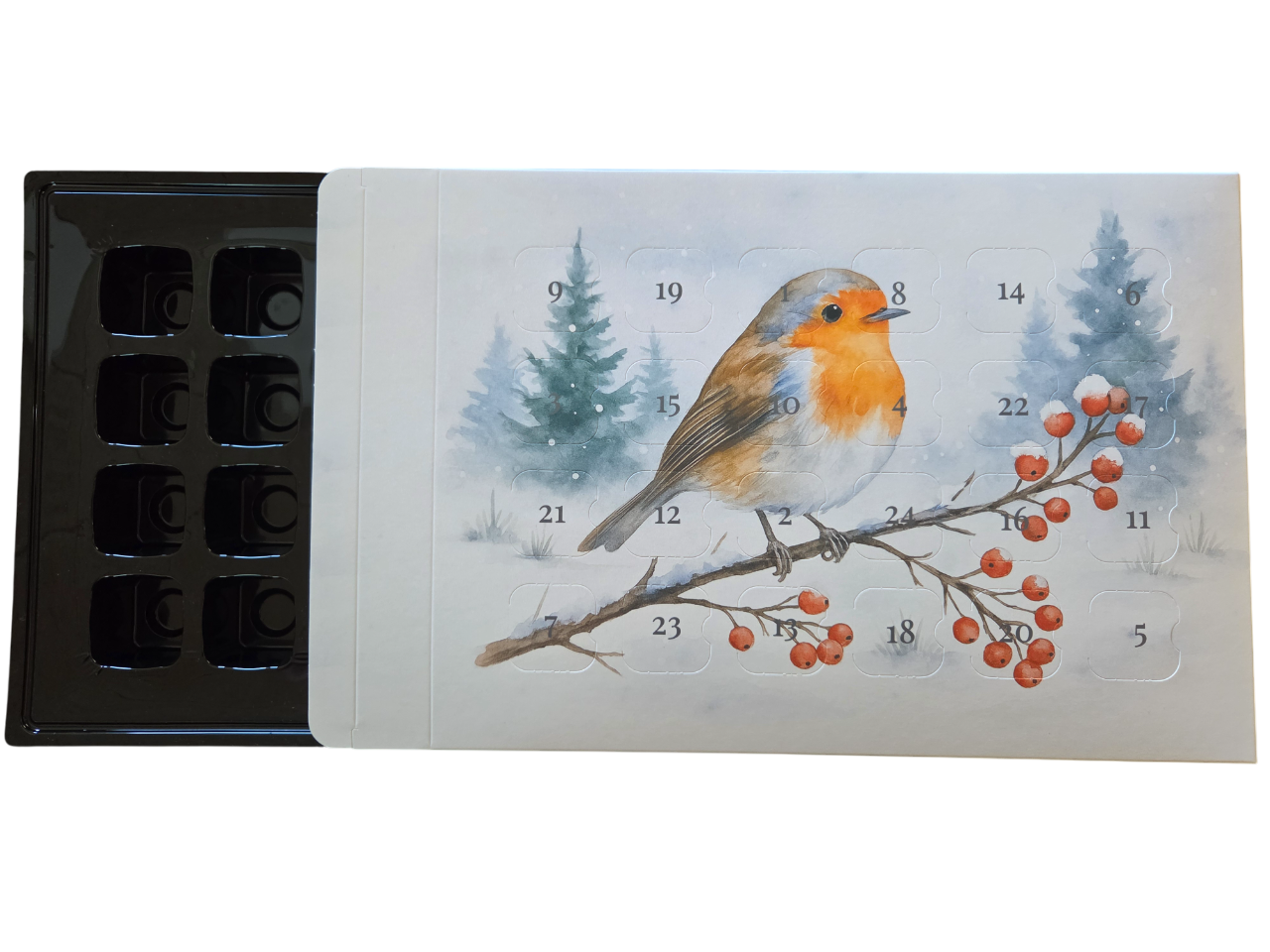 De 24 luckorna döljer avgränsade fack som kan fyllas med choklad/praliner, karameller, små presenter eller hemlagade godsaker. Du kan också använda kalendern för kreativa överraskningar som smycken eller små tvålar.
