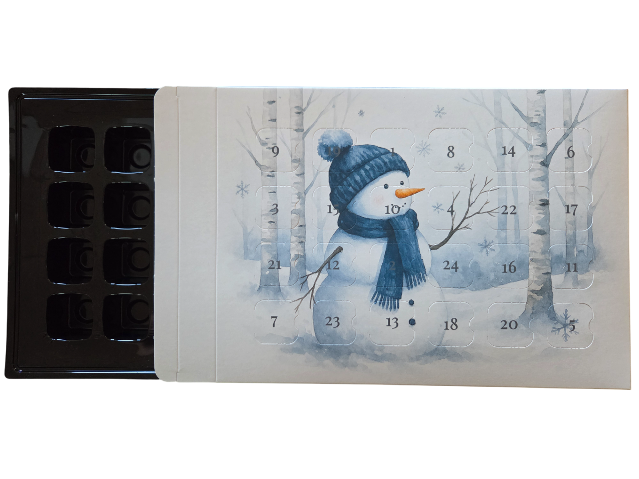 De 24 luckorna döljer avgränsade fack som kan fyllas med choklad/praliner, karameller, små presenter eller hemlagade godsaker. Du kan också använda kalendern för kreativa överraskningar som smycken eller små tvålar.