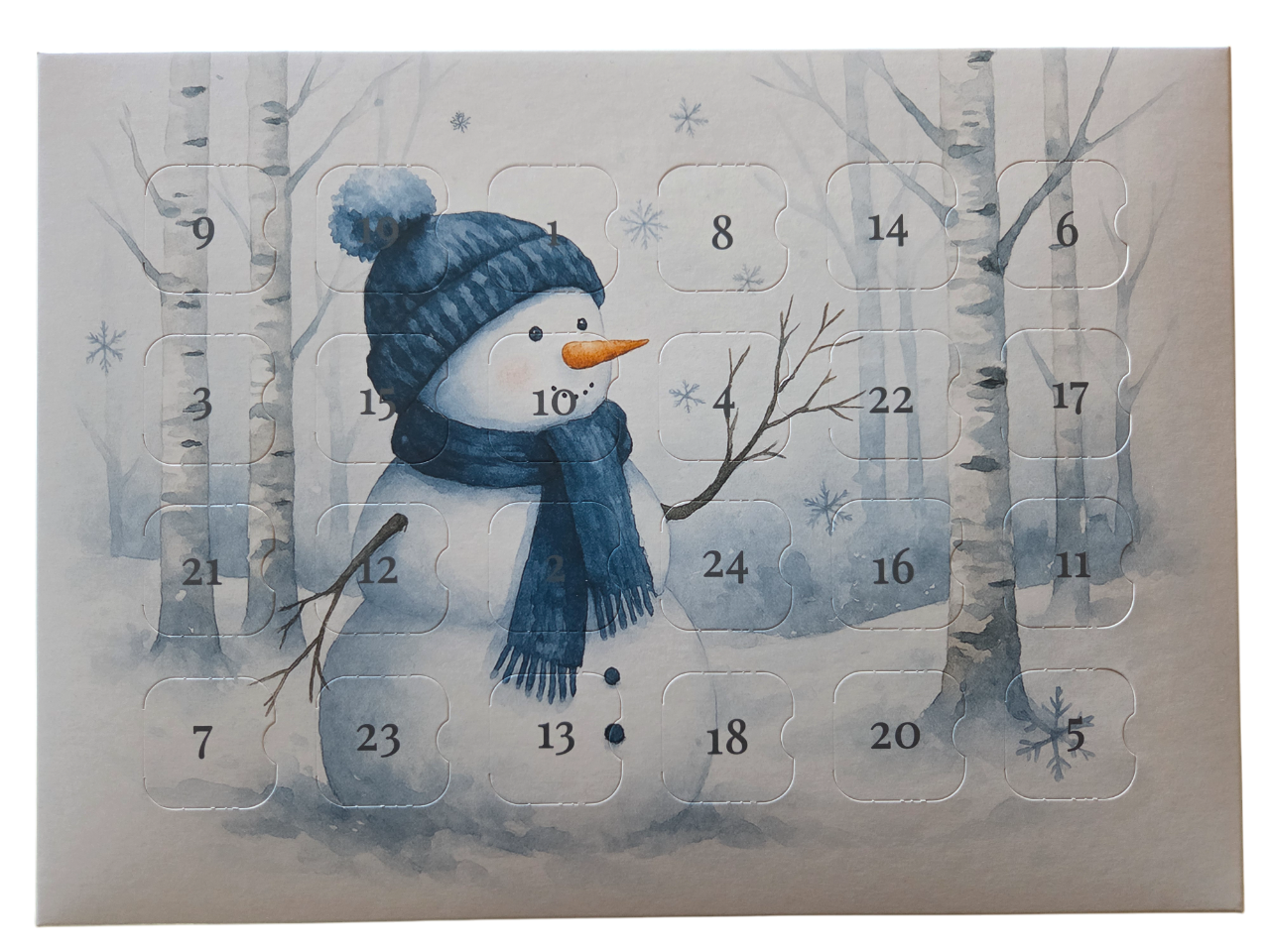”En snögubbe i vinterlandskapet symboliserar barnslig glädje och lek i snön. Jag ville skapa en kalender som väcker minnen om snötäckta decemberdagar och enkla glädjeämnen.”
