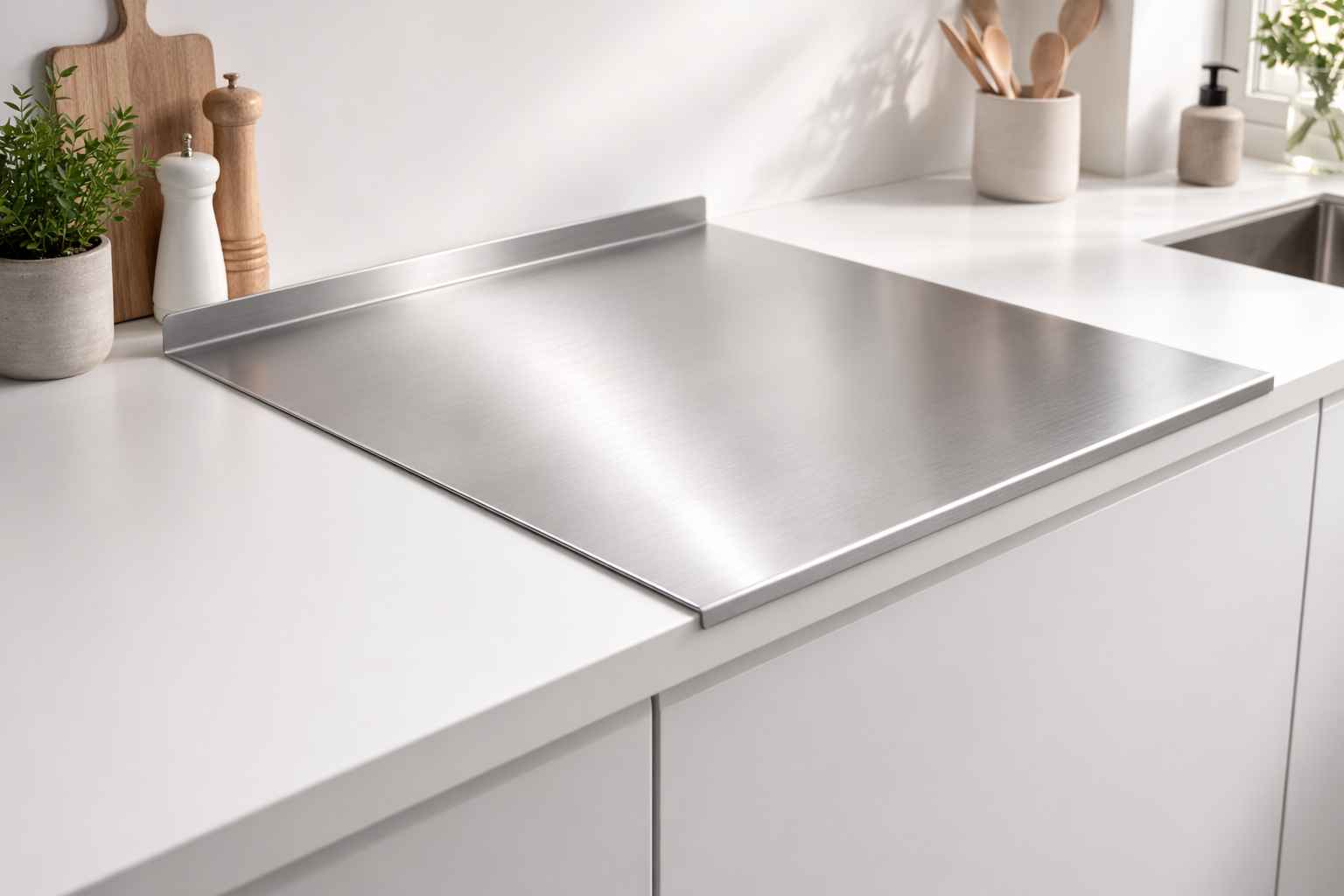 Denna praktiska bänkskiva i rostfritt stål är perfekt för bakning, matlagning och köksarbete där hygien och hållbarhet är i fokus.