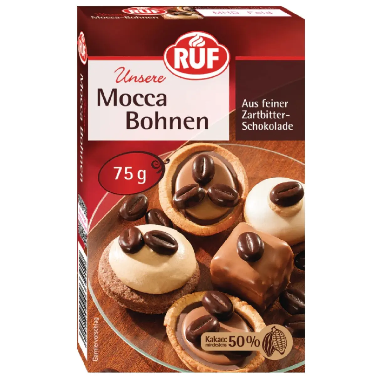 RUF Mocca Beans är en klassisk och dekorativ detalj till tårtor, desserter och andra söta kaffekreationer. De små bönformade chokladbitarna har en fyllig smak med fina kaffetoner och en kakaohalt på 50 %, som ger en intensiv och rundad chokladsmak.