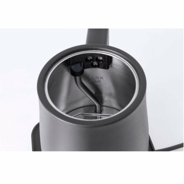 Denna eleganta vattenkokare kombinerar funktionalitet och modern design. Den mattsvarta finishen ger ett exklusivt utseende, medan den långa, böjda pipen säkerställer exakt och enkel hällning – perfekt för te, kaffe eller pour-over-bryggning.