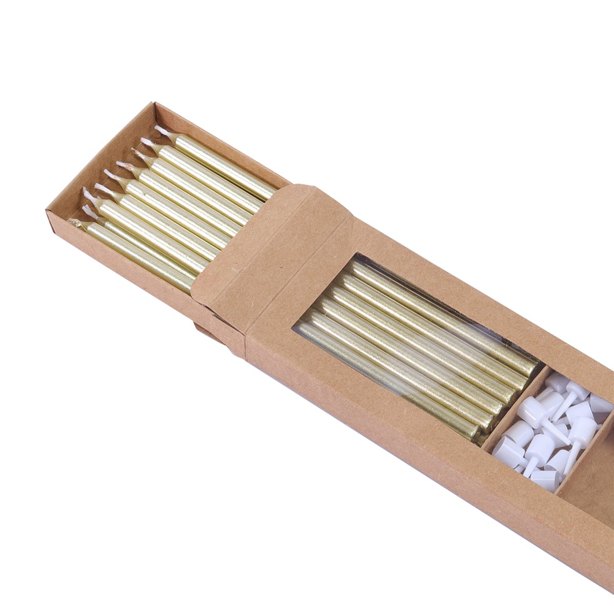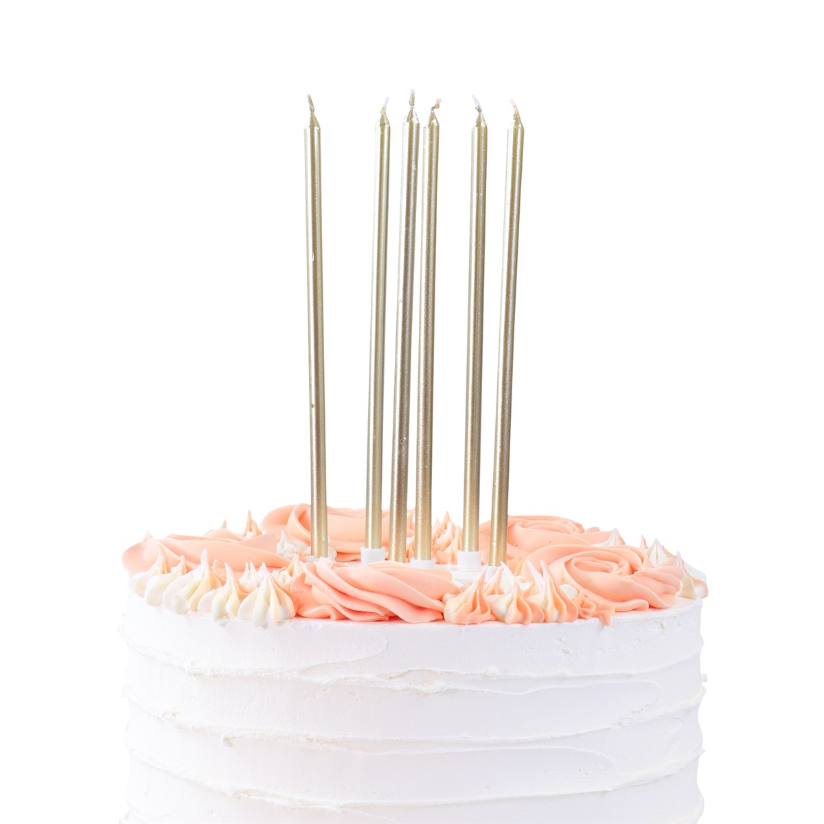 Förpackningen innehåller 16 smala vaxljus i glänsande guld och matchande vita plasthållare som gör det enkelt och säkert att placera ljusen på tårtan.