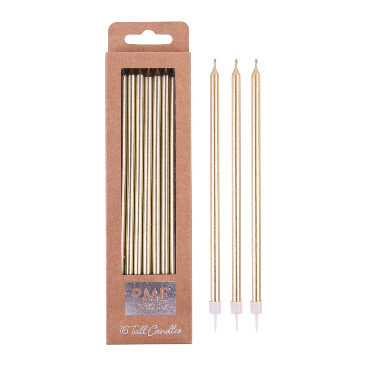 Skapa ett elegant och iögonfallande utseende på din partytårta med dessa extra höga guldljus från PME. Med en höjd på 18 cm ger de en exklusiv och stilfull look som är perfekt för födelsedagar, bröllop och andra speciella tillfällen.