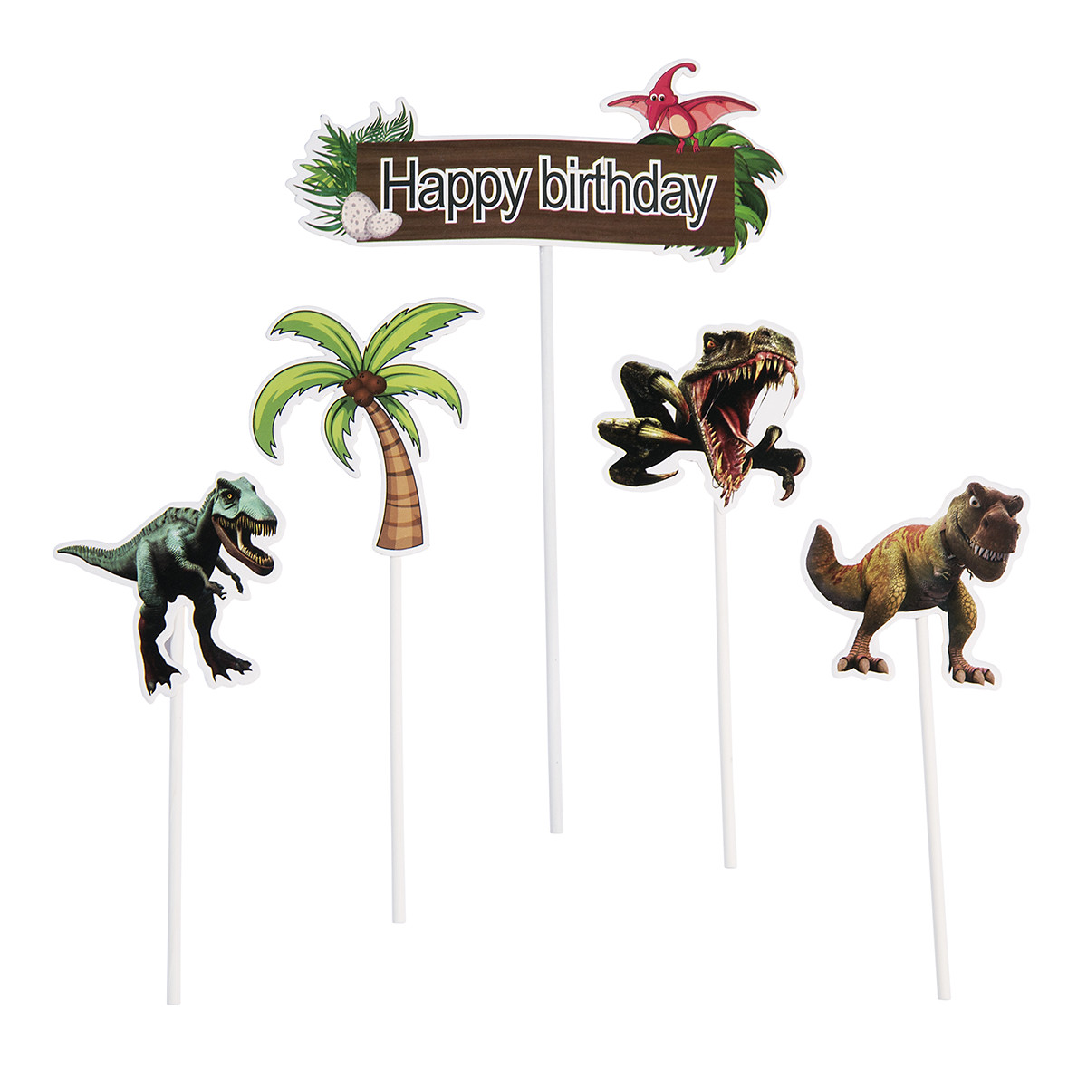 Känner du en riktig dinofantast som snart fyller år? Då är den här uppsättningen cake toppers den perfekta dekorationen! Setet innehåller 5 toppers: