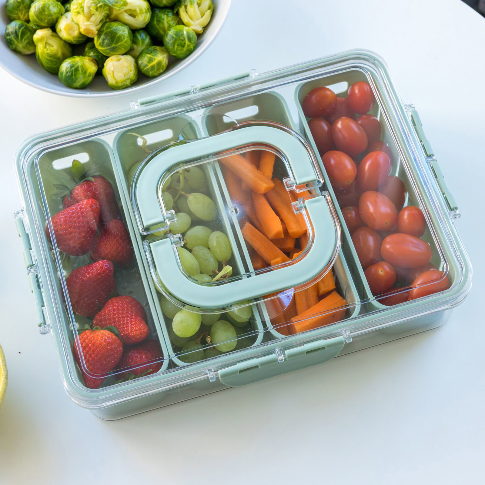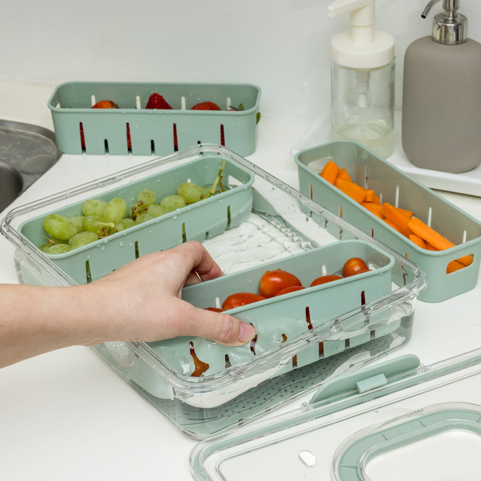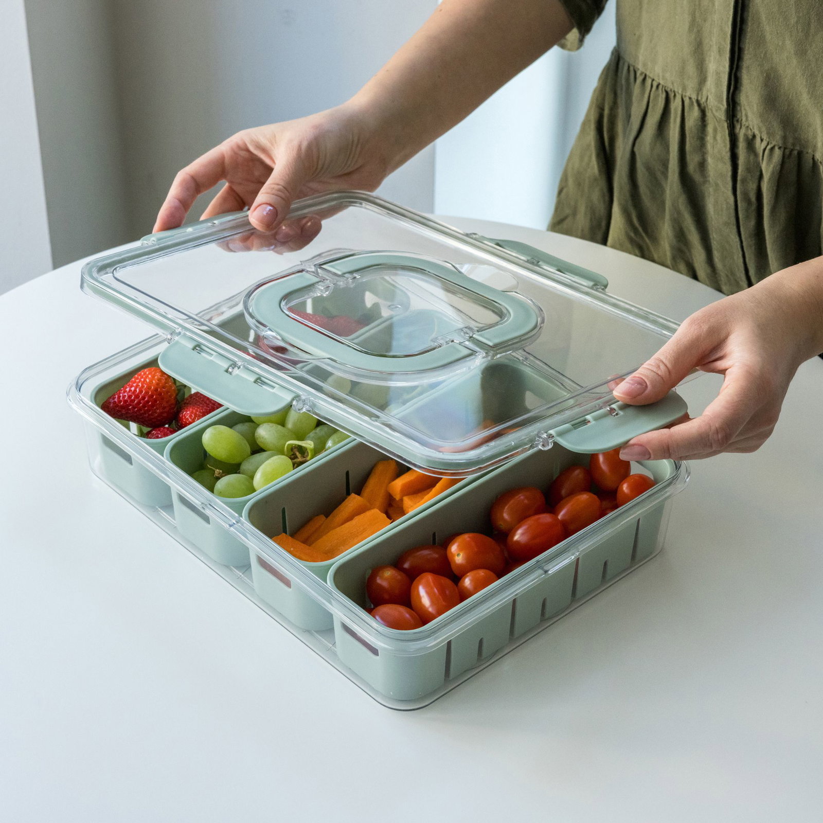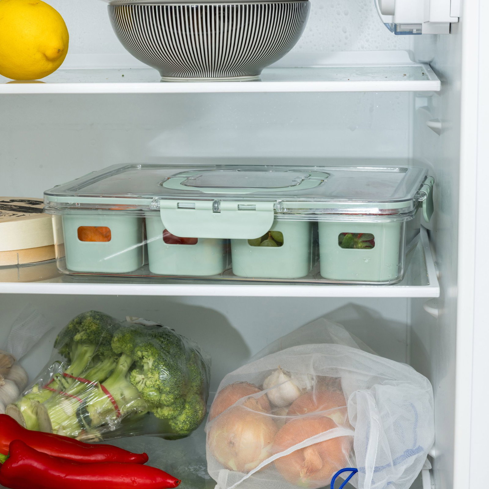 Det genomskinliga locket ger snabb överblick, medan de uttagbara innerlådorna gör organiseringen enkel och flexibel. Perfekt för både kylskåp och matförberedelser.