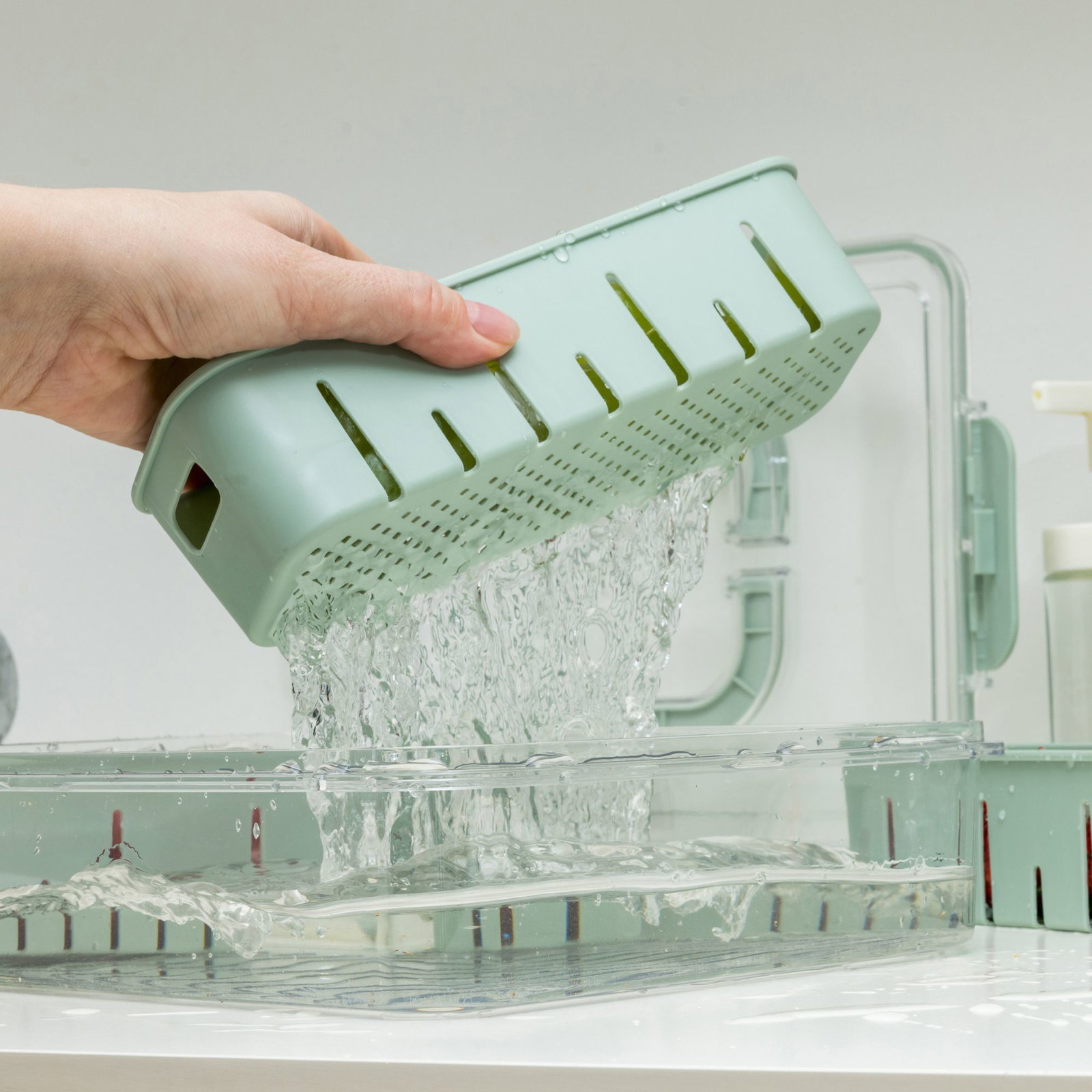 Den här smarta förvaringslådan är designad med inbyggd dränering, så att överskottsvätska leds bort – perfekt efter att du sköljt frukt, grönsaker och bär.