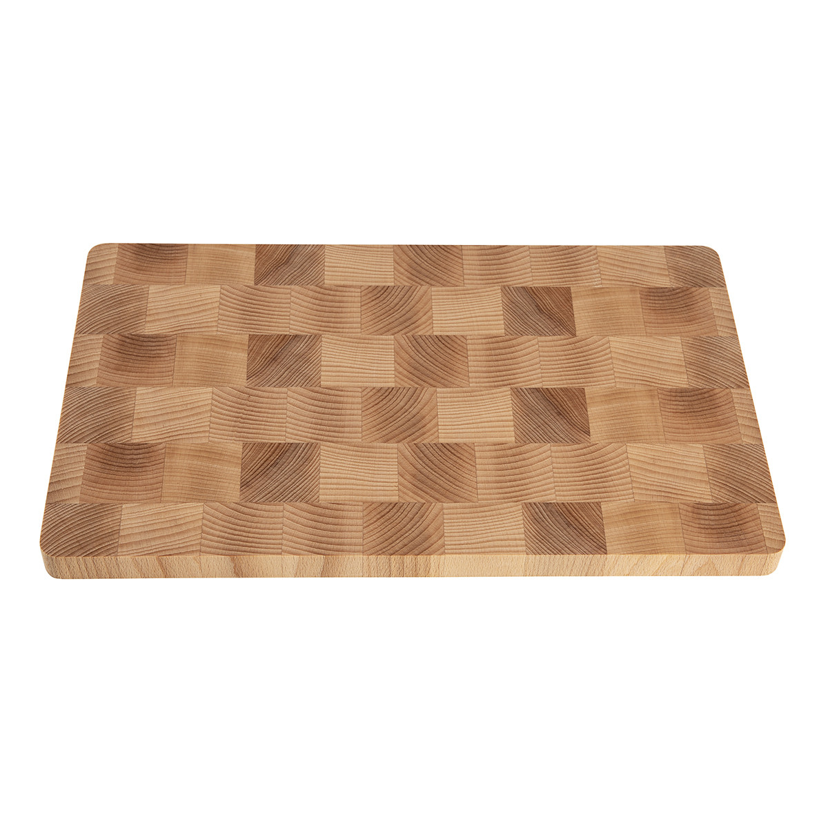 Den här rejäla skärbrädan i trä mäter 40 × 24 × 4 cm och har urtag på sidorna så att du enkelt kan lyfta och bära den.