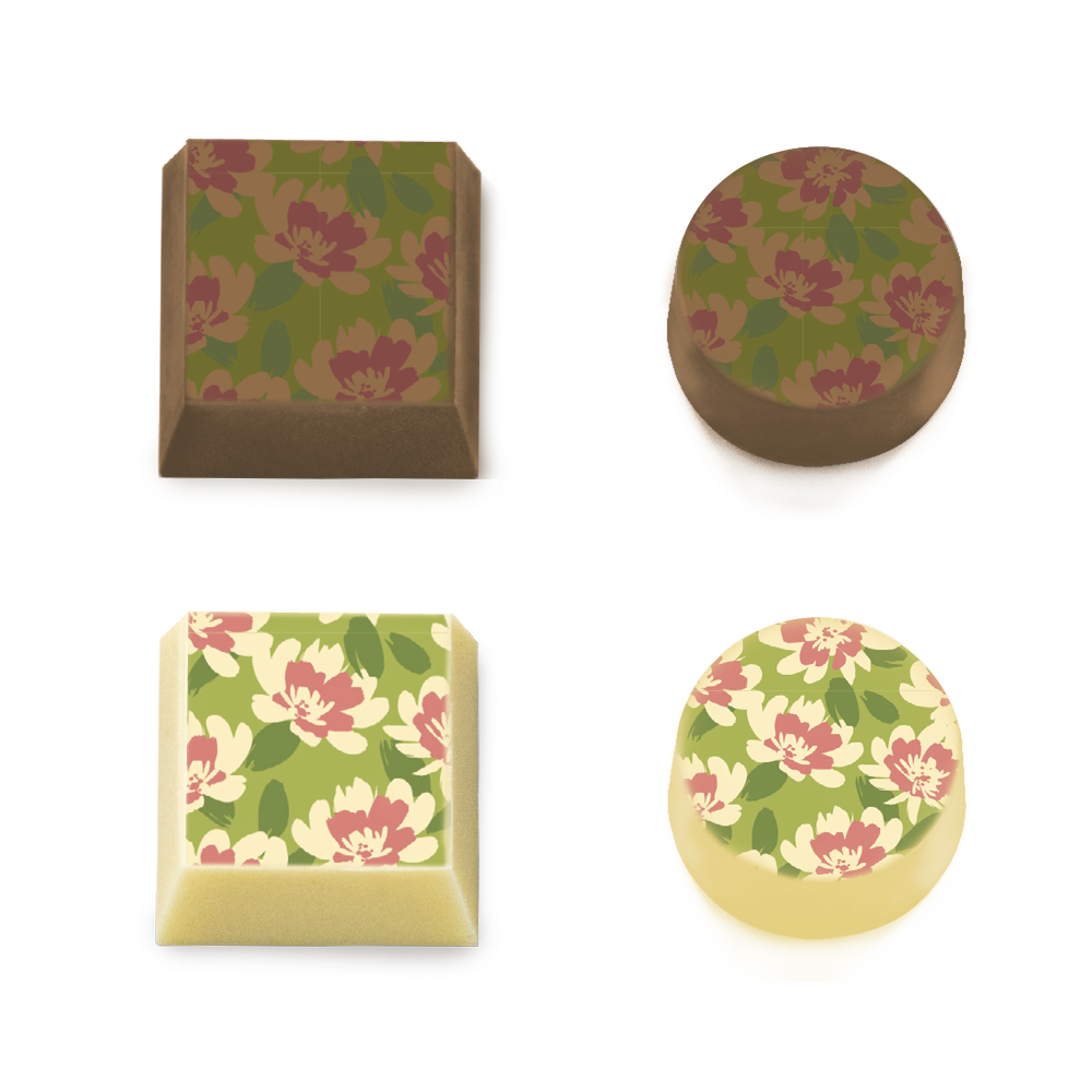 Se hur detta tryck kommer att se ut på vit och mörk choklad på bilderna. Observera att chokladen, oavsett om den är mörk, ljus eller vit, måste vara korrekt tempererad, annars fäster inte arktrycket på chokladen.