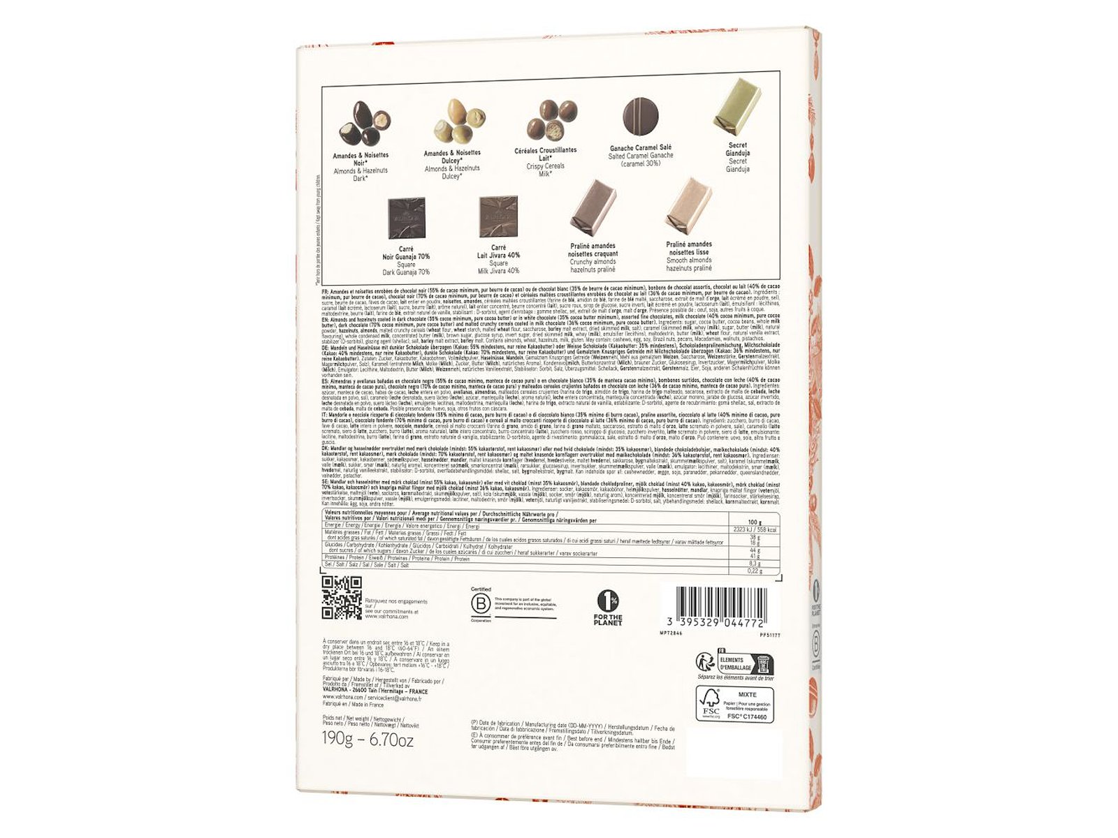 | Ingredienser: socker, kakaosmör, kakaobönor, sötMJÖLKspulver, HASSELNÖTTER, MANDLAR, malda krispiga spannmålsflingor (VETEmjöl, sackaros, malat VETEmjöl, VETEstärkelse, KORNmaltextrakt, skummjölkspulver, salt), kola (skummjölk, vassle (MJÖLK), socker, smör (MJÖLK), naturlig arom), koncentrerad sötMJÖLK, smörkoncentrat (MJÖLK), rörsocker, glukossirap, invertsocker, skummjölkspulver, vassle (MJÖLK), emulgeringsmedel: lecitiner, maltodextrin, smör (MJÖLK), VETEmjöl, naturligt vaniljextrakt, stabiliseringsmedel: D-sorbitol, ytbehandlingsmedel: shellack, salt, KORNmaltextrakt, KORNmalt. Kan innehålla spår av ägg, cashewnötter, soja, paranötter, pekannötter, macadamianötter, valnötter, pistagenötter. |