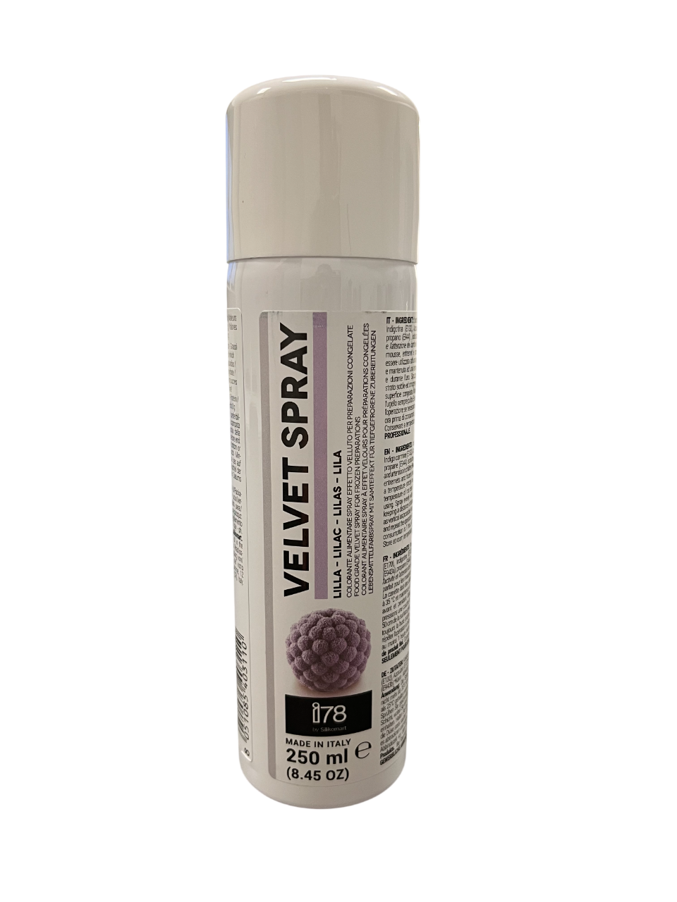 | Innehåller: kakaosmör, färg: Kalciumkarbonat (E170), Indigokarmin (E132), Azorubin (E122); drivgaser: E943a, E944, E943b. *E122 kan ha en negativ effekt på barns aktivitet och koncentration. Kan innehålla spår av mjölk och soja. Maximal dos: 100 g/kg färdig produkt Så här använder du Velvet Spray: Flaskans temperatur får inte vara lägre än 25°C eller högre än 35°C. Om flaskan är för kall kommer vätskan inte ut ur sparflaskan. Skaka väl och spraya på frysta produkter från ett avstånd på 25/30 cm tills önskad yta uppnås. Den rekommenderade vilotiden före konsumtion är en timme. Varning: Måste skyddas från solljus och bör inte utsättas för temperaturer över 50 °C. Inte punktera eller bränna, inte ens efter användning. Spraya inte på öppna lågor eller glödande kroppar. Håll dig borta från antändningskällor. Rök inte i närheten. Förvara den borta från barn. Förvara den på en sval plats. |
