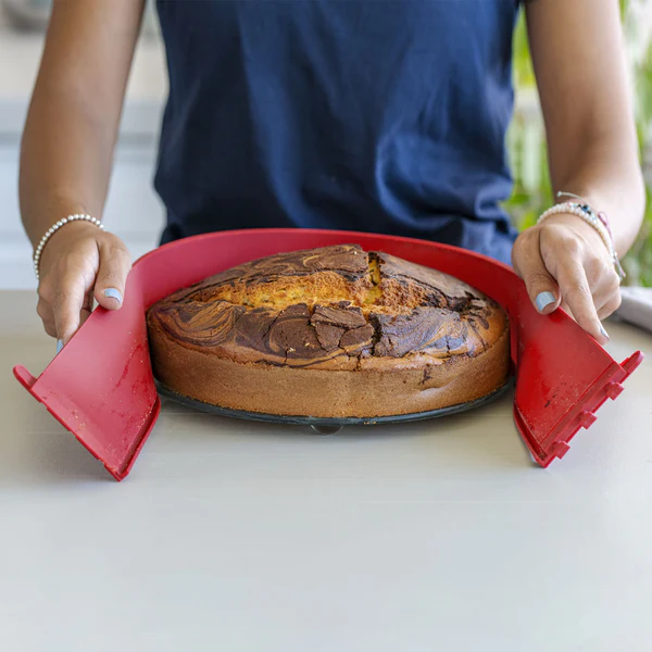 Den stora fördelen? Du behöver inte vända eller flytta din tårta. Den bakas, skärs och serveras direkt på den medföljande glasplattan. De små glasfötterna under basen säkerställer ett bra grepp och ger en fin, upphöjd look på bordet.
